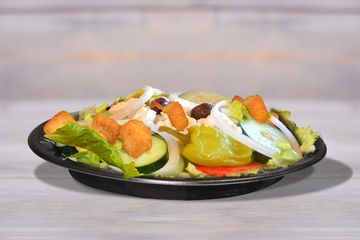 Our Greek Salad beautify by feta cheese, Kalamata olives, tomatoes, and cucumbers, serve it with Greek dressing.