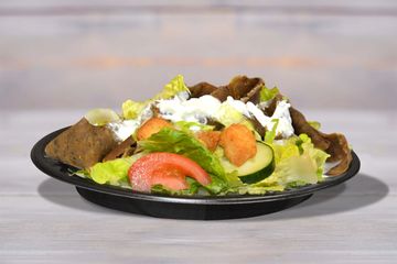 Our Gyro Salad beautify by tomatoes, cucumbers, and thin strips of fresh cut gyro meat.