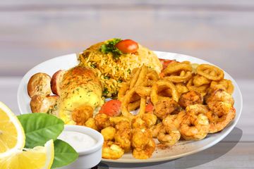 Our Seafood Platter is a Collection of: Shrimp, Calamari Rings, Scallops, Potato, Rice, and Corn.